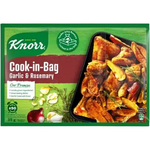 Knorr Cook-in-Bag Garlic & Rosemary 35g offers a simple, fool-proof way to prepare tender, flavourful chicken with minimal effort. This convenient seasoning bag is infused with a perfectly balanced blend of aromatic garlic, fragrant rosemary, and carefully selected herbs and spices. As the chicken cooks inside the heat-resistant bag, the natural juices are locked in, ensuring moist, succulent results every time. There’s no need for added oil or complicated preparation—just place the chicken in the bag, sprinkle in the seasoning, seal, and roast. The bag helps prevent mess and allows the flavours to develop deeply, giving you a delicious, home-cooked meal with very little cleanup. Ideal for busy families or anyone looking to add gourmet flavour to weeknight dinners, this mix pairs beautifully with roasted vegetables, potatoes, salads, or rice. With Knorr Cook-in-Bag Garlic & Rosemary, wholesome, flavour-packed cooking becomes effortless.