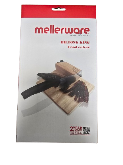 The Mellerware Biltong King Food Cutter (model BC002) is a well-designed, manual slicer ideal for cutting up biltong with precision and ease. Built around a high-quality stainless-steel blade, the cutter incorporates a detachable knife that makes cleaning simple and allows the blade to be used separately if needed. It sits on an anti-bacterial bamboo chopping block, helping you maintain hygiene while preparing cured meat. A built-in tungsten-carbide knife sharpener keeps the blade sharp for long-term use, and a compact spanner is included for easy removal and re-fitting of the blade. Safety is emphasized in the user manual, highlighting the very sharp cutting blade and recommending careful handling. Overall, the cutter is sturdy, practical, and tailored to the needs of biltong enthusiasts.